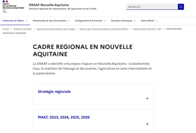 La DRAAF Nouvelle-Aquitaine centralise tous les documents officiels afférents aux Mesures Agro-Environnementales. Au moindre doute sur le cahier des charges d'une mesure ou la notice du territoire, c'est bien sur ces pages qu'il faut vous rendre afin de trouver des réponses actualisées :